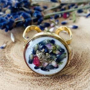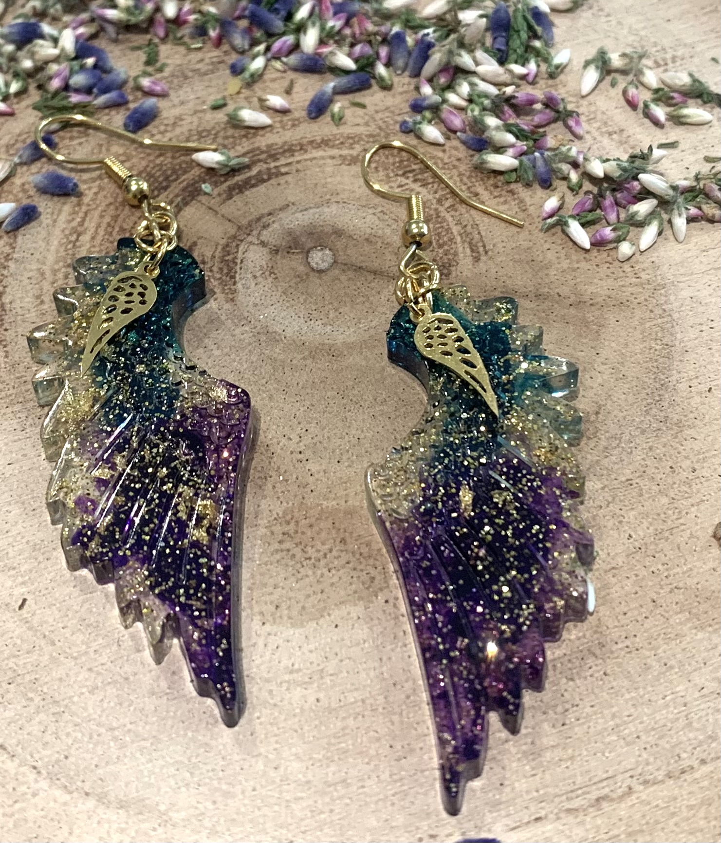Kolczyki wkładane w kształcie skrzydeł w kolorze transparentnym z odrobiną fioletu i zieleni, z drobinkami złotego brokatu i złotej foli. Z małą zawieszką ze stali chirurgicznej w w kształcie skrzydła.