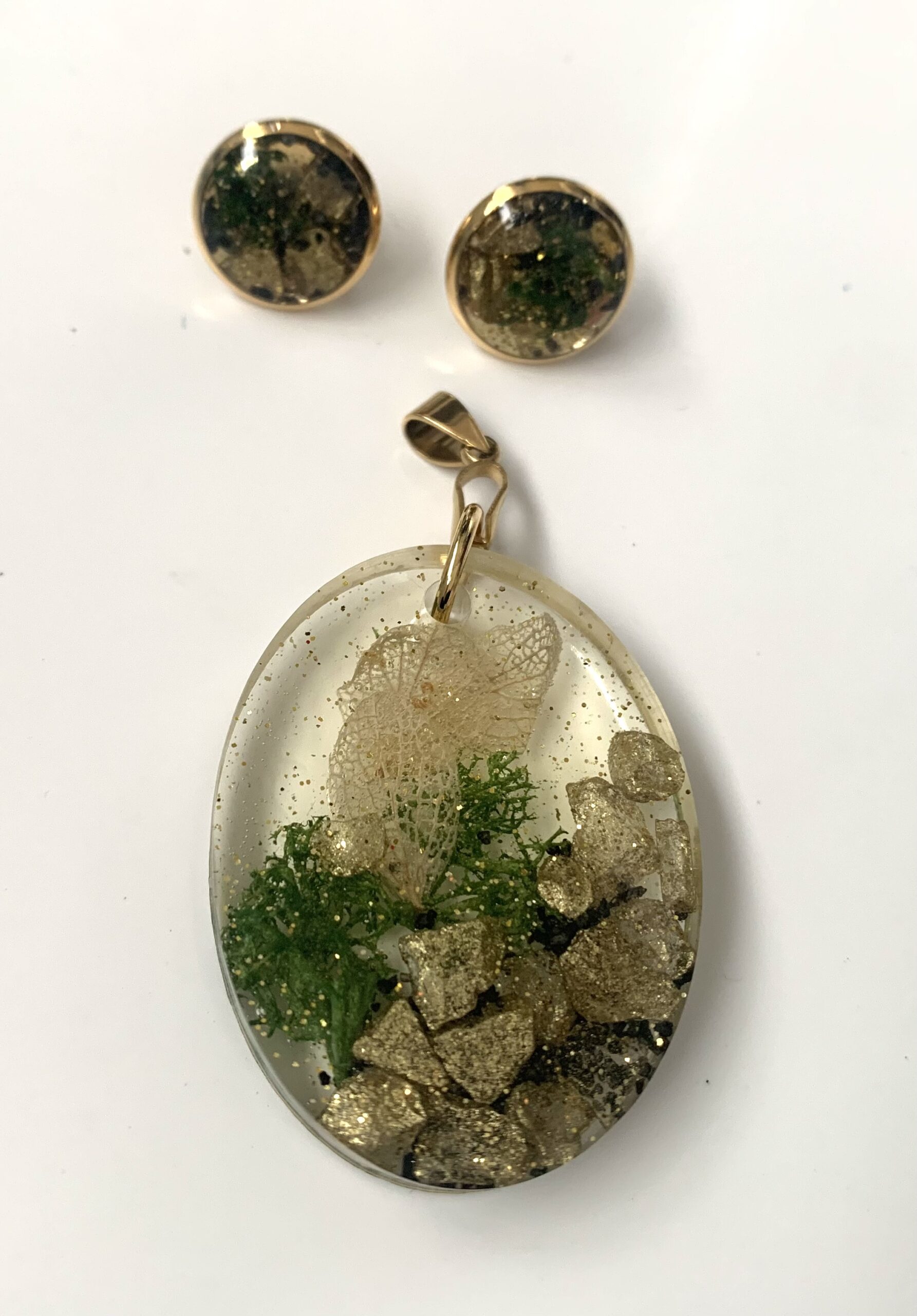 Żywica transparentna z drobinkami złotego brokatu. Zatopione zostały suszone rośliny( płatki kwiatów i mech chrobotek), kamyszki w kolorze złotym i ziarenka czarnego piasku.